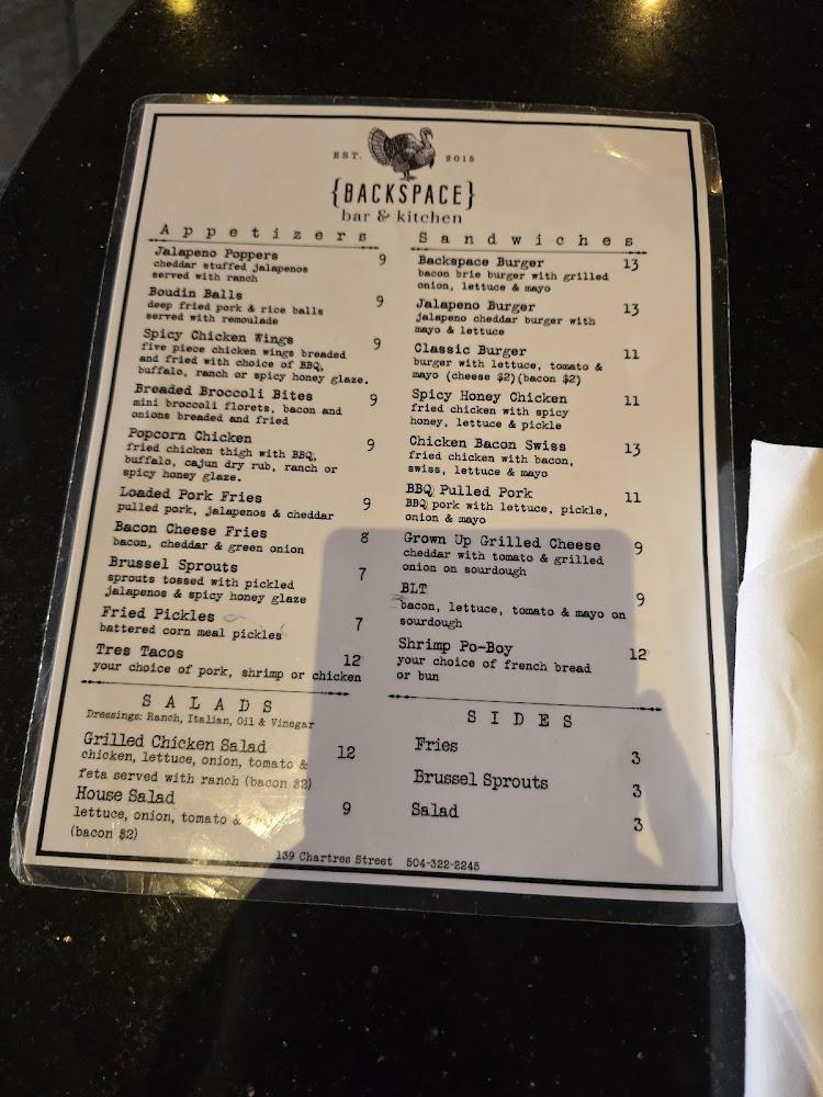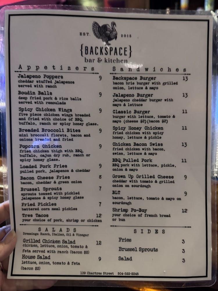 The menu features appetizers such as Boudin Balls and Spicy Chicken Wings. For main courses, sandwiches like the Backspace Burger deliver rich comfort. Prices are reasonable, making quality food accessible for all.